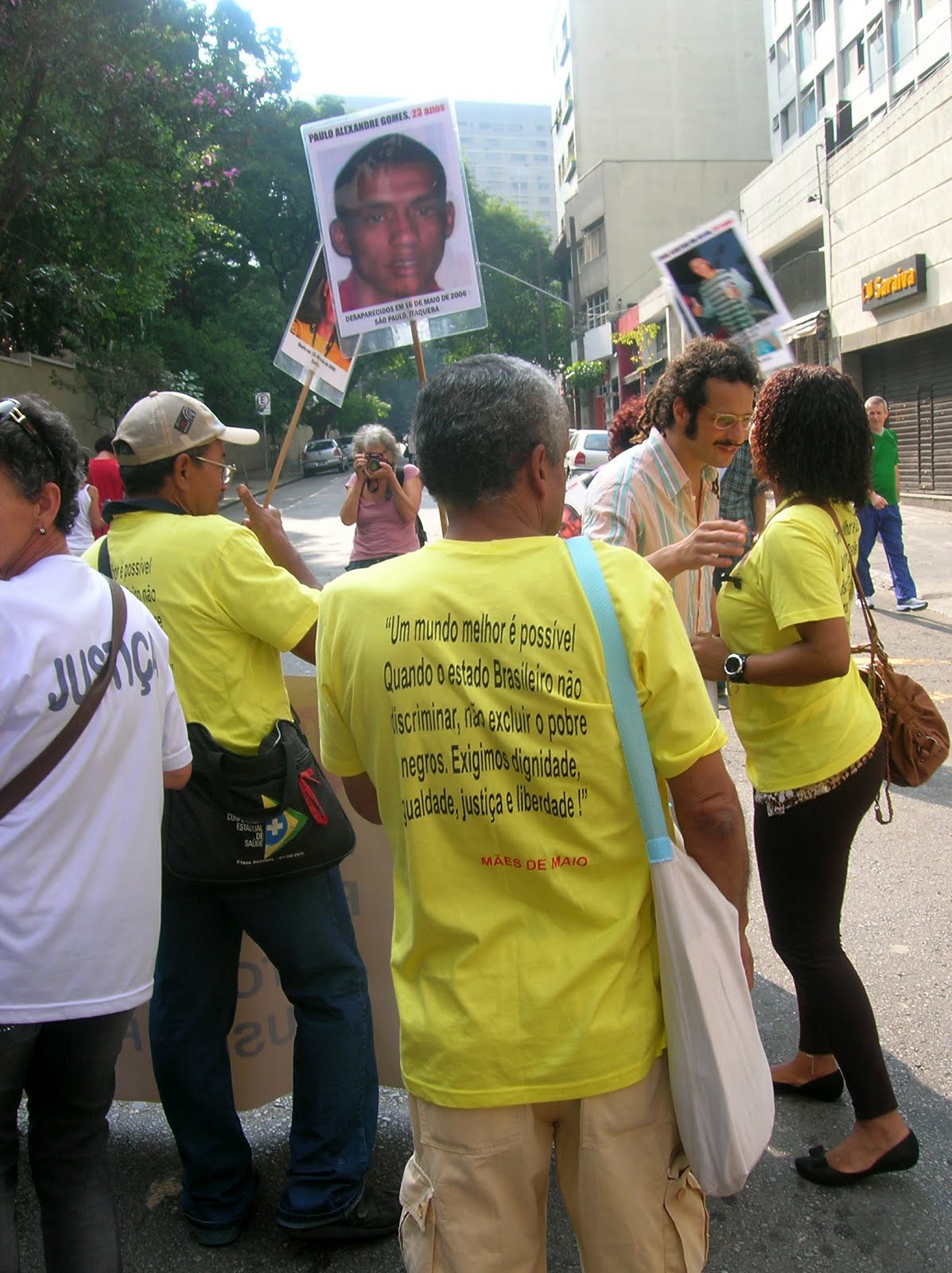 Na Rua Maria Antônia, vemos novamente a comissão de frente da passeata, composta pelas Mães de Maio. Desta vez deste ângulo, para se ver a mensagem da camiseta: "Um mundo melhor é possível: Quando o Estado não mais discriminar, não excluir o pobre e negros. Exigimos dignidade, igualdade, justiça e liberdade!".