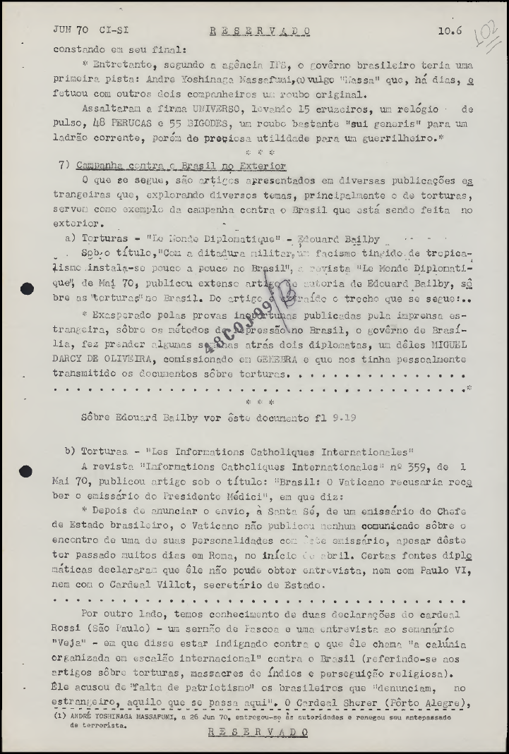 Esse esforço contava com a ajuda dos civis favoráveis ao regime ditatorial e genocida. Neste Boletim do SNI sobre o "comunismo internacional", de junho de 1970, conta-se que Agnelo Rossi, então Cardeal de São Paulo, "disse estar indignado contra o que ele chama 'a calúnia organizada em escalão internacional contra o Brasil' (referindo-se aos artigos sobre torturas, massacres de índios e perseguição religiosa)."; em tal situação, ele via "falta de patriotismo".