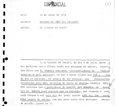 O documento, assim, como seguinte, está no Arquivo Nacional. A análise oficial era típica da época: "os contatos mantidos pela dra. ENY MOREIRA no exterior com entidades e pessoas engajadas em movimentos de Defesa dos Direitos da Pessoa Humana, repercutirão negativamente, mostrando um quadro distorcido da realidade brasileira, proporcionando, em consequência, um clima de hostilidade ao regime de governo vigente no BRASIL.".