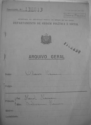 Na capa de seu prontuário no DOPS/SP (reproduzo aqui os documentos, guardados no Arquivo Público do Estado de São Paulo), o nome já estava errado. Citei neste blogue a decisão que trancou o inquérito penal militar que fingiu apurar as circunstâncias de sua morte em 1970; o nome, no decorrer dos autos, era Hansen. Documentos de prisões anteriores, no entanto, citam às vezes seu nome corretamente. Apenas às vezes. Em alguns deles, ele se torna Haussen (exibo um exemplo ao lado). O sobrenome chegou a ser metamorfoseado, em um registro, em Hansan.