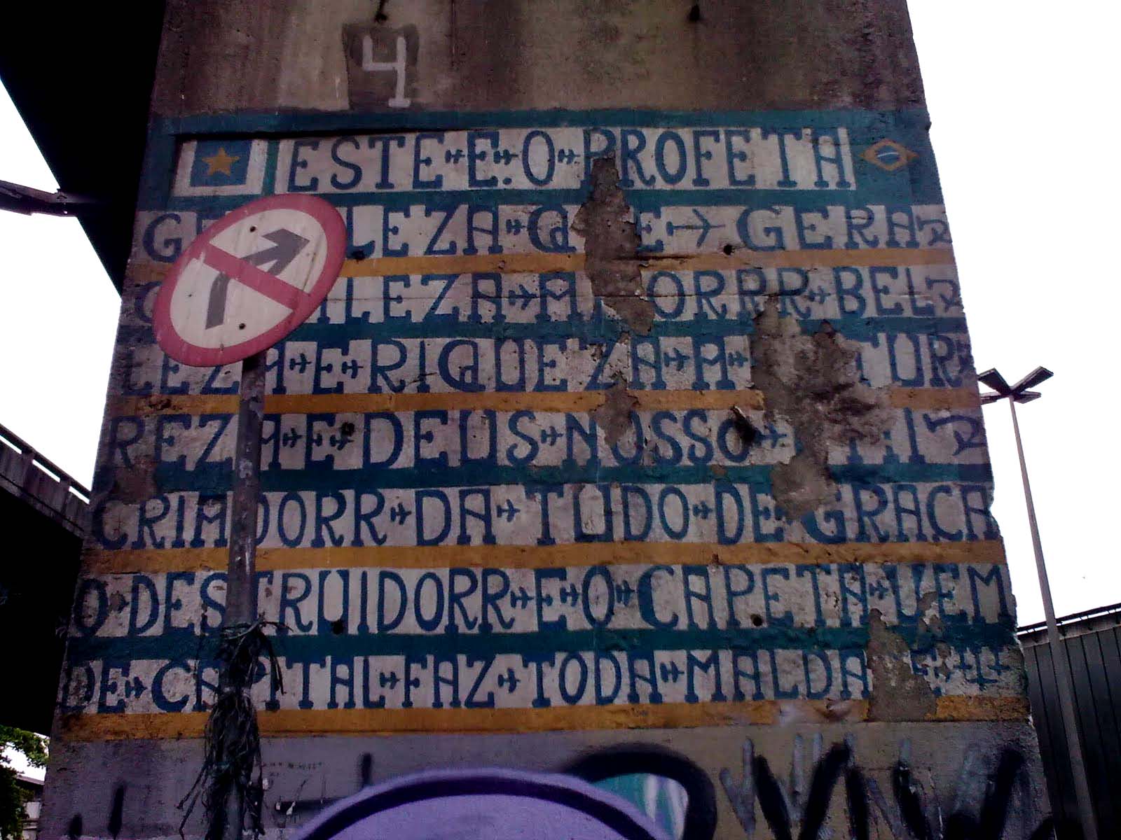 A partir de 1980, ele fez várias inscrições (como a que podem ver acima) nas pilastras do Viaduto do Caju. Dessa forma, as mensagens do Profeta Gentileza transformaram-se em patrimônio da cidade do Rio de Janeiro. As instituições, em princípio, tentaram ignorá-las ou lutar contra elas: a COMLURB chegou a apagar inscrições.