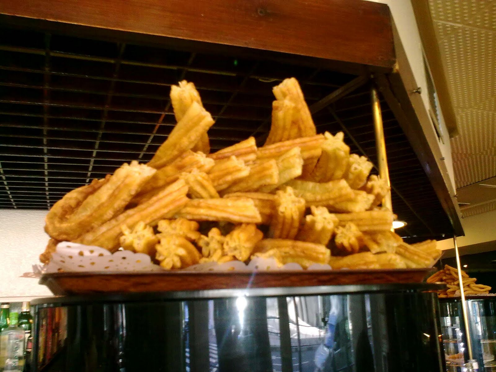 Não é doce, nem salgada, explicaram-me (não a provei). Parece com churros, porém não possui recheio. As fotos mostram seu preço e como os espanhóis a consomem; a segunda imagem mostra um prato cheio da iguaria. Tirei as duas em Madri, no Café Santander.