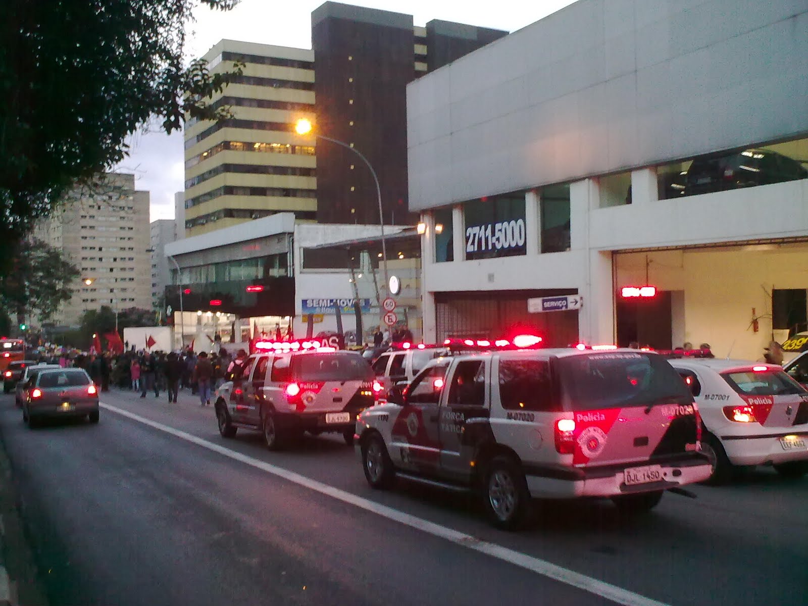 No final temporal dela, o mesmo ocorreu: os policiais, que tiveram um dia tranquilo (pois tudo foi pacífico, com exceção deste incidente, para o qual a Folha de S.Paulo deu outra versão), continuavam acompanhando maciçamente a manifestação. Com os manifestantes, várias viaturas entraram na Rua Barão de Itapetininga. Era muito bem humorado o cartaz que pedia menos bombas e mais diálogo aos policiais.Ignoro, naturalmente, quantos policiais infiltrados havia entre os manifestantes - no ano passado, no ataque ao movimento de greve dos professores de São Paulo, descobriu-se o policial infiltrado somente porque socorreu uma colega. Esses "elementos" parecem ter a função de vigiar e também causar confrontos.
