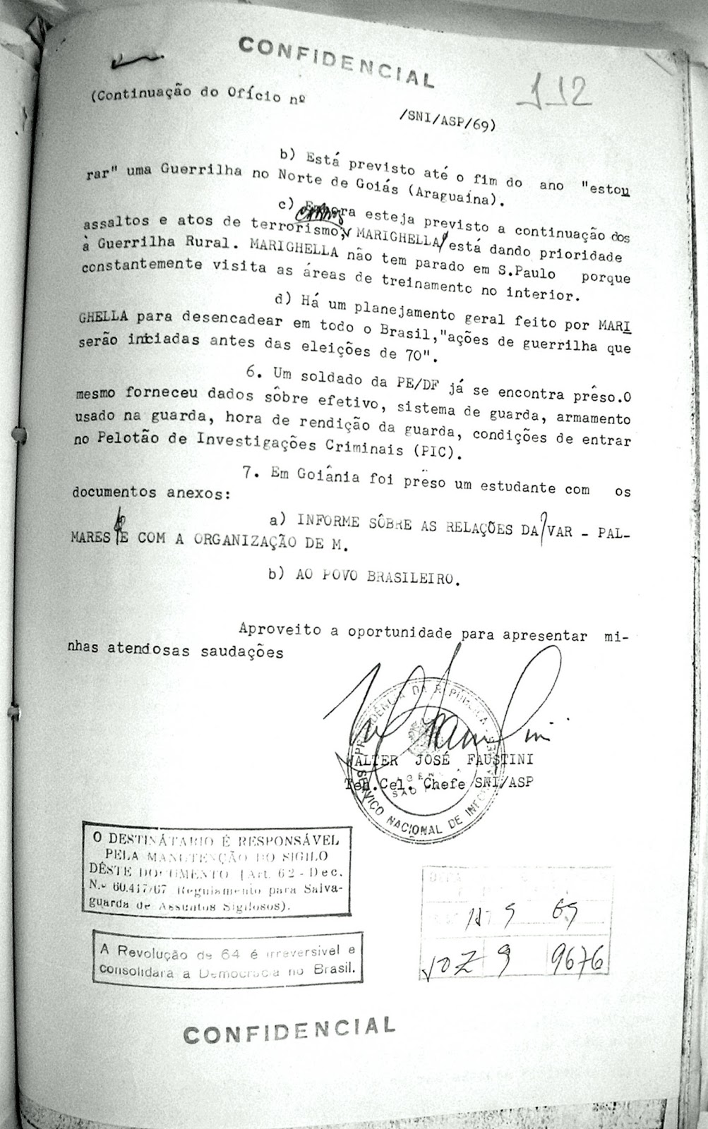 Mais adiante, na página 513, Mário Magalhães cita parte de um documento do SNI, datado de 3 de setembro de 1969. Ele pode ser lido no Arquivo Público do Estado de São Paulo: