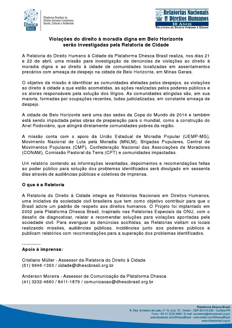 Recebi este cartaz para divulgação. Dias 21 e 22 de abril, a Relatoria do Direito Humano à Cidade realizará uma missão em Belo Horizonte para averiguar as violações ao direito à moradia, agora causadas principalmente pelos empreendimentos para a Copa do Mundo.