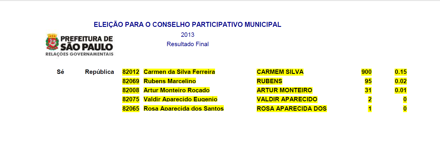 Em certas áreas da periferia, como Brasilândia, a participação e a disputa foram muito maiores dos 75 candidatos, 26 lograram vaga no Conselho. Em Cidade Tiradentes, 21 eleitos em 77 candidatos. Jardim Ângela teve 27 eleitos em 88. Comparando com uma área de elite, o Morumbi, com 5 eleitos de 13 candidatos, a disputa não foi pequena.