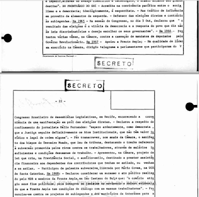 Logo acima, vê-se trecho da 45a. sessão do Conselho de Segurança Nacional, em 16 de janeiro de 1969. Com os poderes do AI-5, entre os deputados federais que foram cassados estava Paulo Macarini, do MDB de Santa Catarina. Vejam que seu prontuário elaborado pelo SNI registrava, entre outras ocorrências consideradas subversivas, que era "Defensor das eleições diretas" e que sugeriu uma manifestação em prol das eleições diretas aos parlamentares que participavam do V Congresso Brasileiro das Assembleias Legislativas.