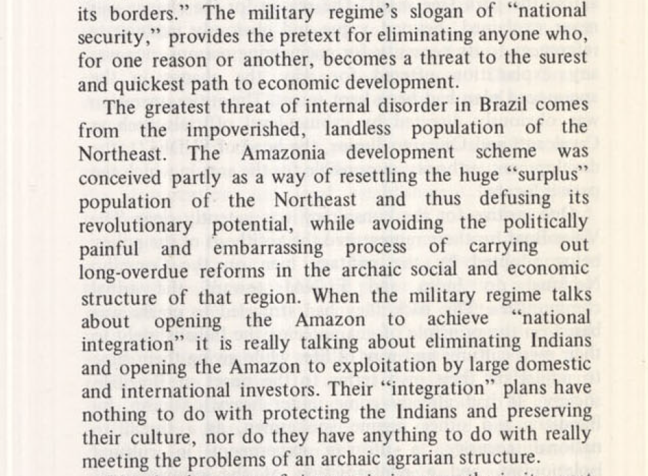 Essas coisas não podiam ser ditas no Brasil (lembremos, por exemplo, do samba-enredo Aruanã Açu, sobre a resistência indígena, composto por Martinho da Vila para a Unidos de Vila Isabel em 1974, que foi censurado e teve de ser trocado por uma exaltação à Transamazônica). No exterior, porém, as denúncias ocorriam. Ao lado, incluí trecho do Brazilian Information Bulletin de janeiro de 1973 (consultei-o no repositório digital da Brown University) que é claro em afirmar que a "segurança nacional" era um pretexto para eliminar aqueles que se revelassem uma ameaça ao rápido desenvolvimento, e que a "integração nacional' significava a eliminação dos índios, sem mexer na arcaica estrutura agrária.