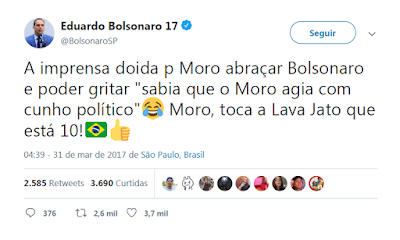 desmorolizado, como antecipara em 2017 o próprio deputado reeleito, escrevendo o óbvio: se o então juiz abraçasse Bolsonaro seriam confirmadas as suspeitas da imprensa de que "agia com cunho político" e não jurídico: